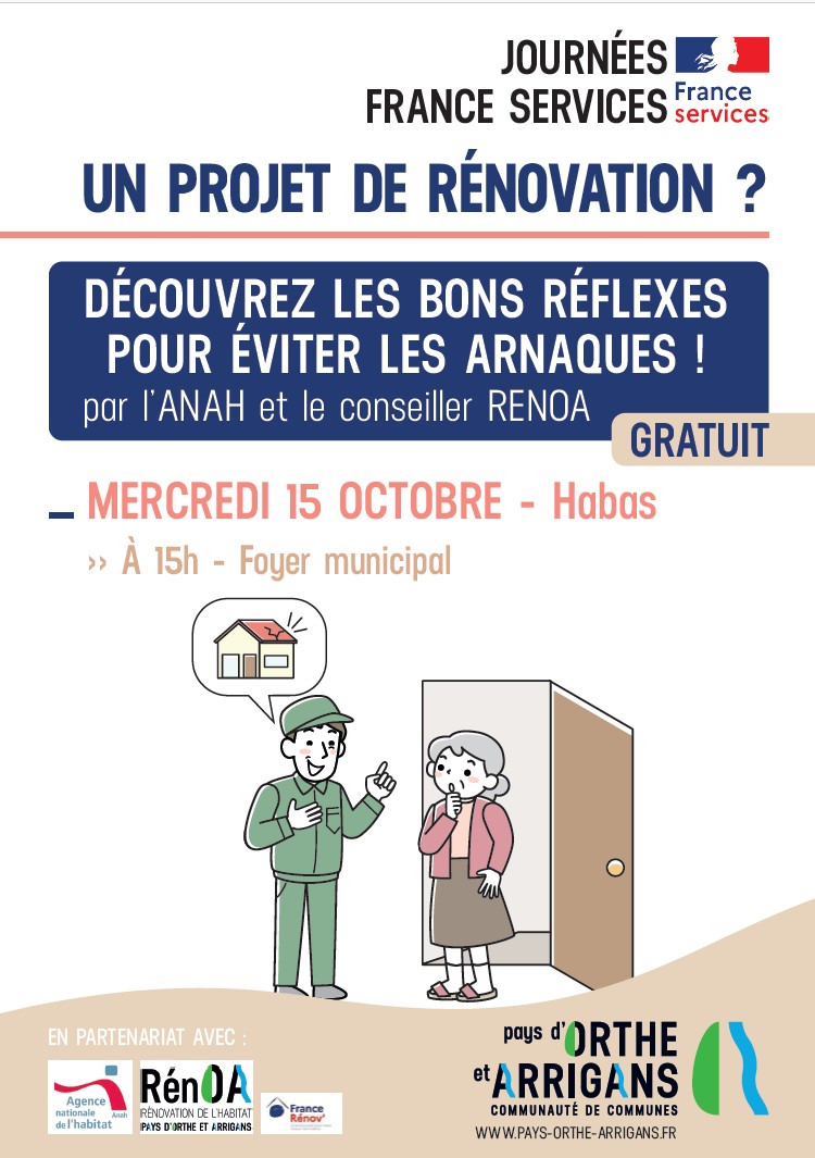 🏡 Dans le cadre des Journées France Services 2025, en partenariat avec l’ANAH, France Rénov’ et RénOA (Rénovation de l’habitat) du Pays d’Orthe et Arrigans, vous propose une rencontre spéciale :